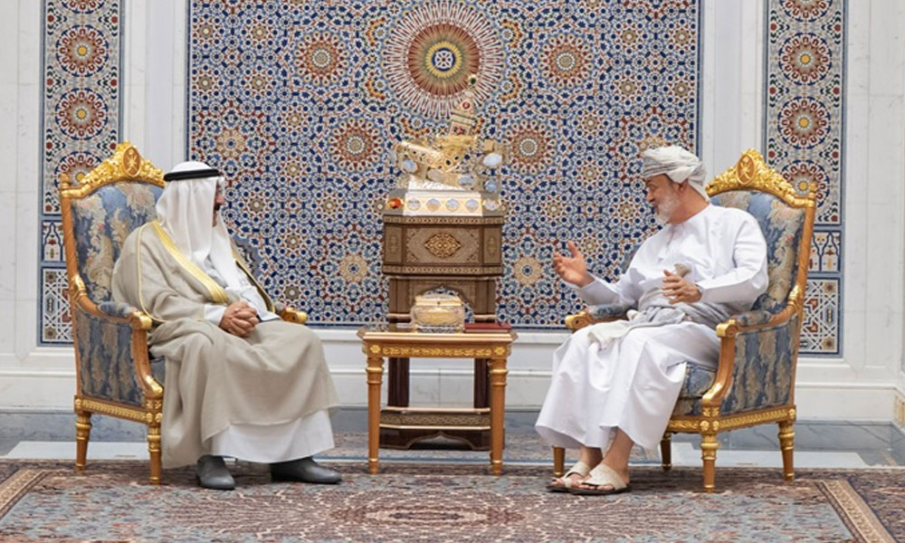 حضرة صاحب السمو أمير البلاد الشيخ مشعل الأحمد الجابر الصباح وسلطان عمان حضرة صاحب الجلالة السلطان هيثم بن طارق المعظ