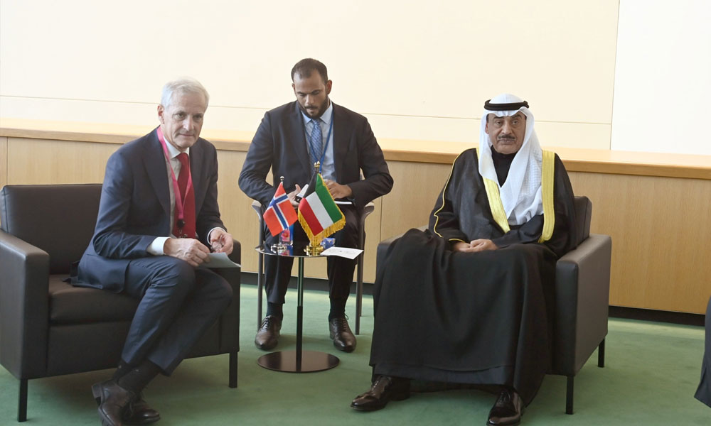 التقى ممثل حضرة صاحب السمو أمير البلاد الشيخ مشعل الأحمد الجابر الصباح حفظه الله ورعاه سمو ولي العهد الشيخ صباح خالد الحمد الصباح حفظه الله اليوم رئيس وزراء مملكة النرويج الصديقة جوناس جار ستور على هامش أعمال اجتماعات الدورة الـ80 للجمعية العامة للأمم المتحدة في مقر الوفد الدائم لدولة الكويت لدى الأمم المتحدة بمدينة نيويورك في الولايات المتحدة الأمريكية.